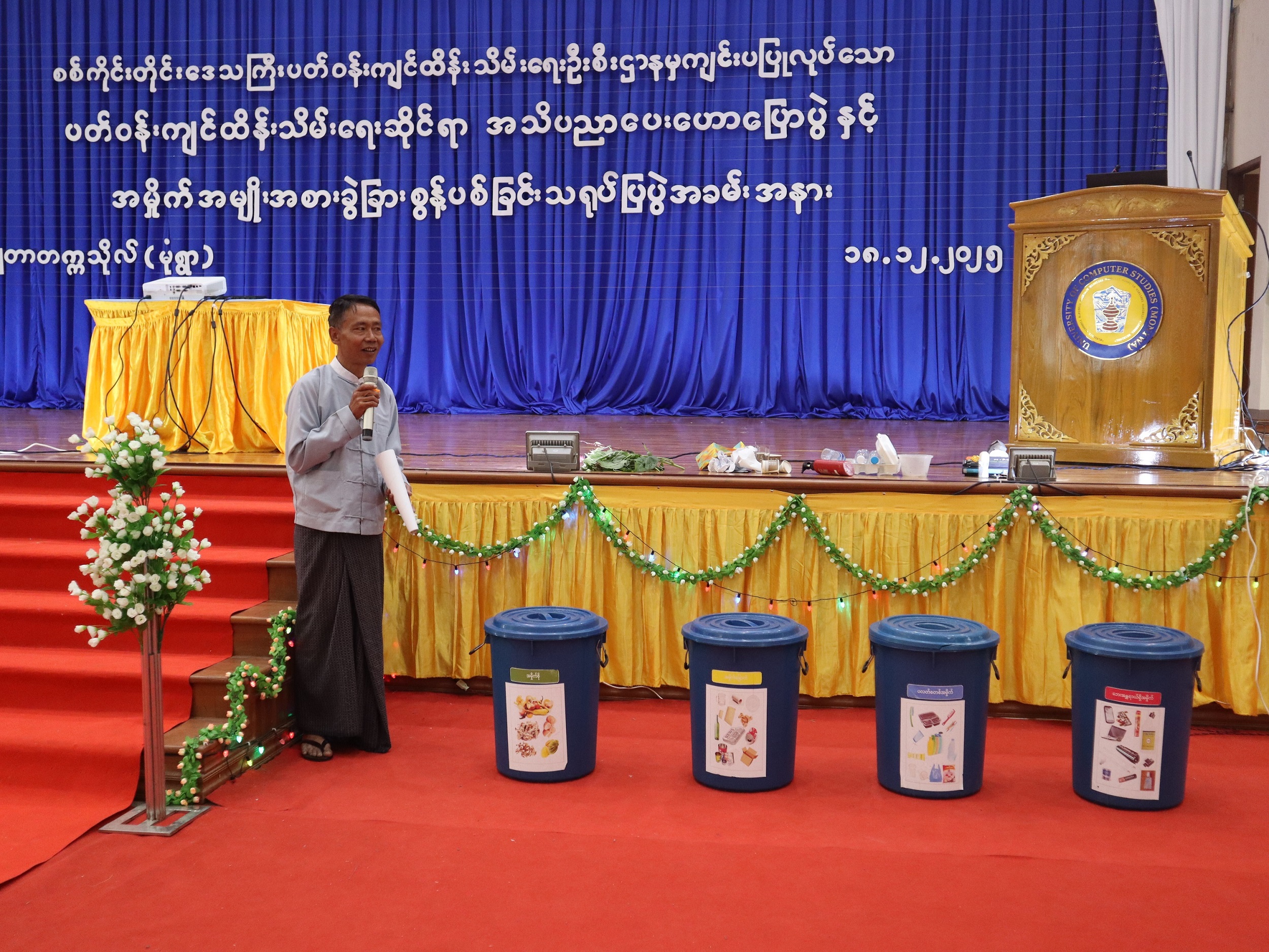 ကွန်ပျူတာတက္ကသိုလ်(မုံရွာ)၊ ပတ်ဝန်းကျင်ထိန်းသိမ်းရေးဆိုင်ရာ အသိပညာပေးဟောပြောပွဲနှင့် အမှိုက်အမျိုးအစားခွဲခြားစွန့်ပစ်ခြင်း သရုပ်ပြပွဲ အခမ်းအနား ကို (၁၈-၁၂-၂၀၂၅) ရက်နေ့တွင် ကွန်ပျူတာတက္ကသိုလ်(မုံရွာ)၊ ဘွဲ့နှင်းသဘင်ခန်းမတွင် ကျင်းပပြုလုပ်ခဲ့ပါသည်။ အဆိုပါအခမ်းအနား တွင် စစ်ကိုင်းတိုင်းဒေသကြီး၊ ပတ်ဝန်းကျင်ထိန်းသိမ်းရေးဦးစီးဌာန၊ ညွှန်ကြားရေးမှူးမှ “နိုင်ငံတော်သာယာဖို့ သဘာဝပတ်ဝန်းကျင်ထိန်းသိမ်းစို့ ” ခေါင်းစဉ်ဖြင့် သဘာဝပတ်ဝန်းကျင်ထိန်းသိမ်းရေးဆိုင်ရာ အကြောင်းအရာများကို အသိပညာပေးဟောပြောခဲ့ပြီး