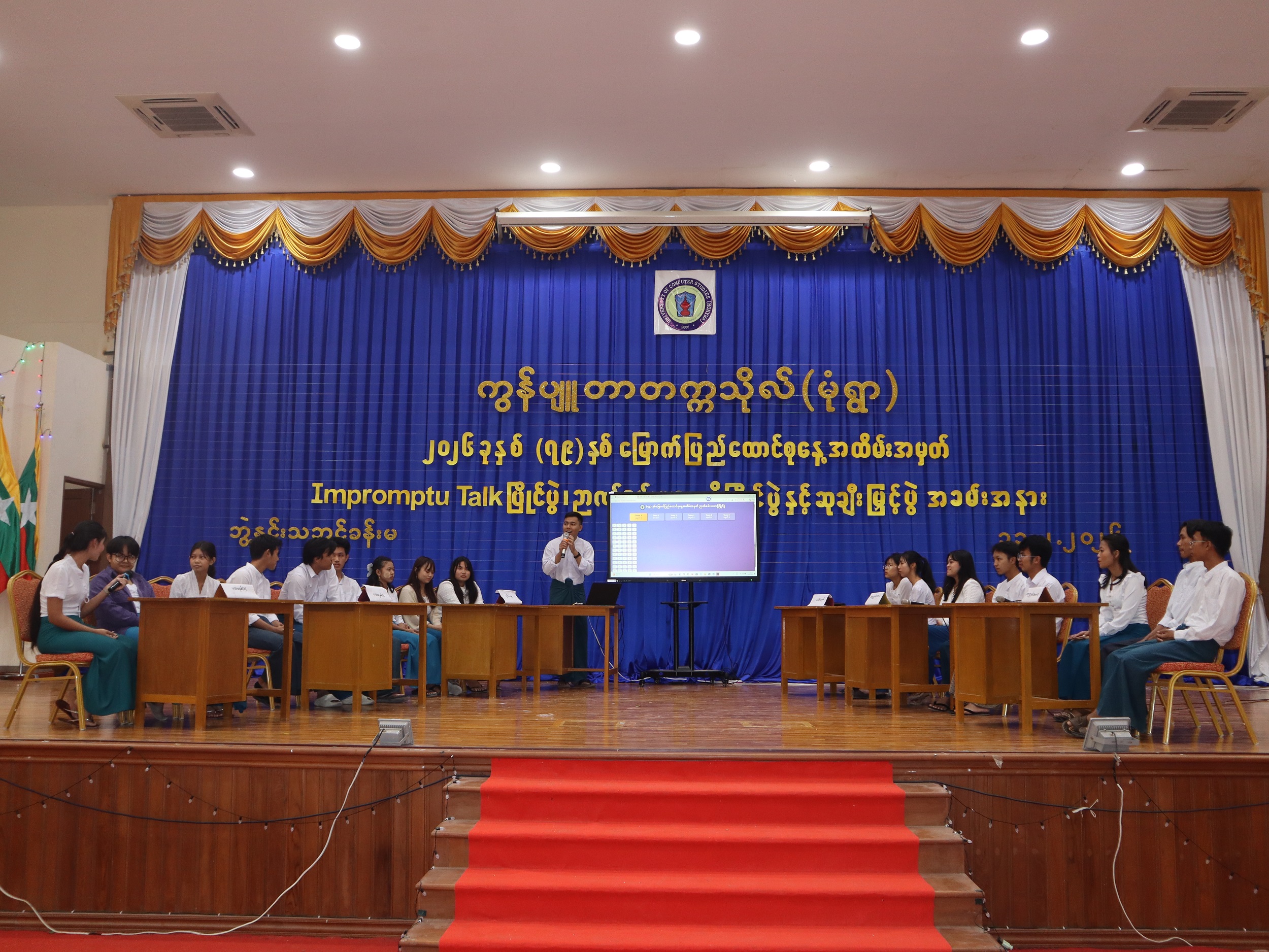(၇၉)နှစ်မြောက် ပြည်ထောင်စုနေ့အထိမ်းအမှတ် စာစီစာကုံး၊ Impromptu Talk၊ ဉာဏ်စမ်းပဟေဠိ ပြိုင်ပွဲ နှင့် ဆုချီးမြှင့်ပွဲအခမ်းအနား ကျင်းပခြင်း Posted on February 13, 2026February 18, 2026 by cumonywa ၂၀၂၆ ခုနှစ်၊ (၇၉)နှစ်မြောက် ပြည်ထောင်စုနေ့ အထိမ်းအမှတ် စာစီစာကုံး၊ Impromptu Talk၊ ဉာဏ်စမ်းပဟေဠိ ပြိုင်ပွဲ နှင့် ဆုချီးမြှင့်ပွဲ အခမ်းအနားကို (၁၁-၂-၂၀၂၆) ရက်နေ့တွင် ကွန်ပျူတာက္ကသိုလ်(မုံရွာ)၊ ဘွဲ့နှင်းသဘင်ခန်းမ၌ ကျင်းပပြုလုပ်ခဲ့ပါသည်။ အဆိုပါအခမ်းအနားတွင် ကွန်ပျူတာက္ကသိုလ်(မုံရွာ)၊ ပါမောက္ခချုပ်မှ အဖွင့်အမှာစကားပြောကြားခဲ့ပြီး ဆုရရှိခဲ့ကြသော ကျောင်းသား/သူများကို ဆုများအသီးသီး... Read More